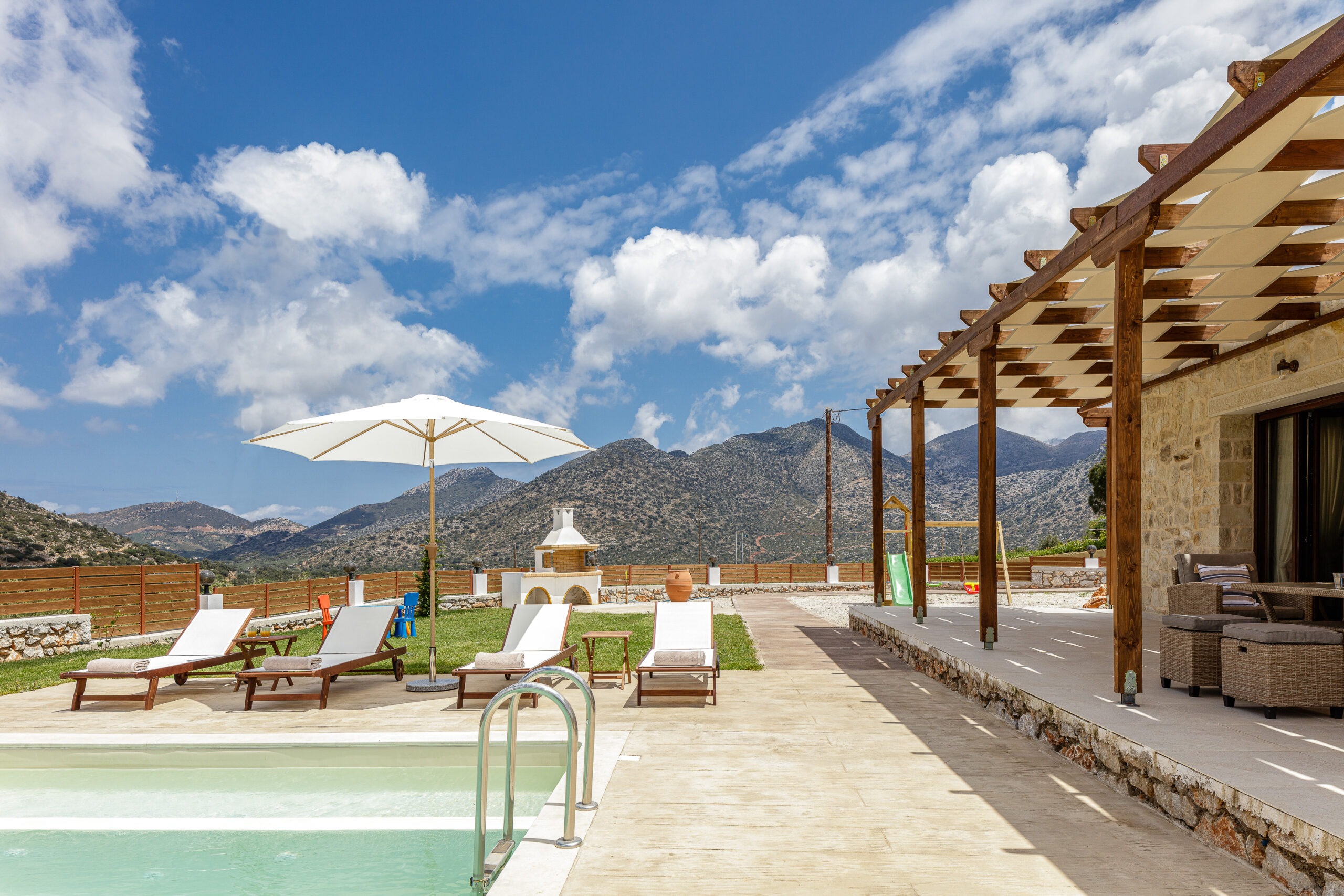 Τελείως αυτόνομες μεταξύ τους, η κάθε βίλα διαθέτει ιδιωτική πισίνα, καταπράσινο κήπο 2 στρεμμάτων με εξωτερικά σαλόνια, ξαπλώστρες, bbq, παιδική χαρά και ιδιωτικό πάρκινγκ. Η κάθε μία μπορεί να φιλοξενήσει 7 άτομα σε 3 master υπνοδωμάτια με υπέρδιπλα κρεβάτια και ιδιωτικά μπάνια. Έχουν ευρύχωρο καθιστικό, ένα επιπλέον μπάνιο με προδιαγραφές ΑΜΕΑ, δωμάτιο αποθήκευσης και κουζίνα πλήρως εξοπλισμένη με όλες τις ηλεκτρικές συσκευές και σκευή μαγειρικής.